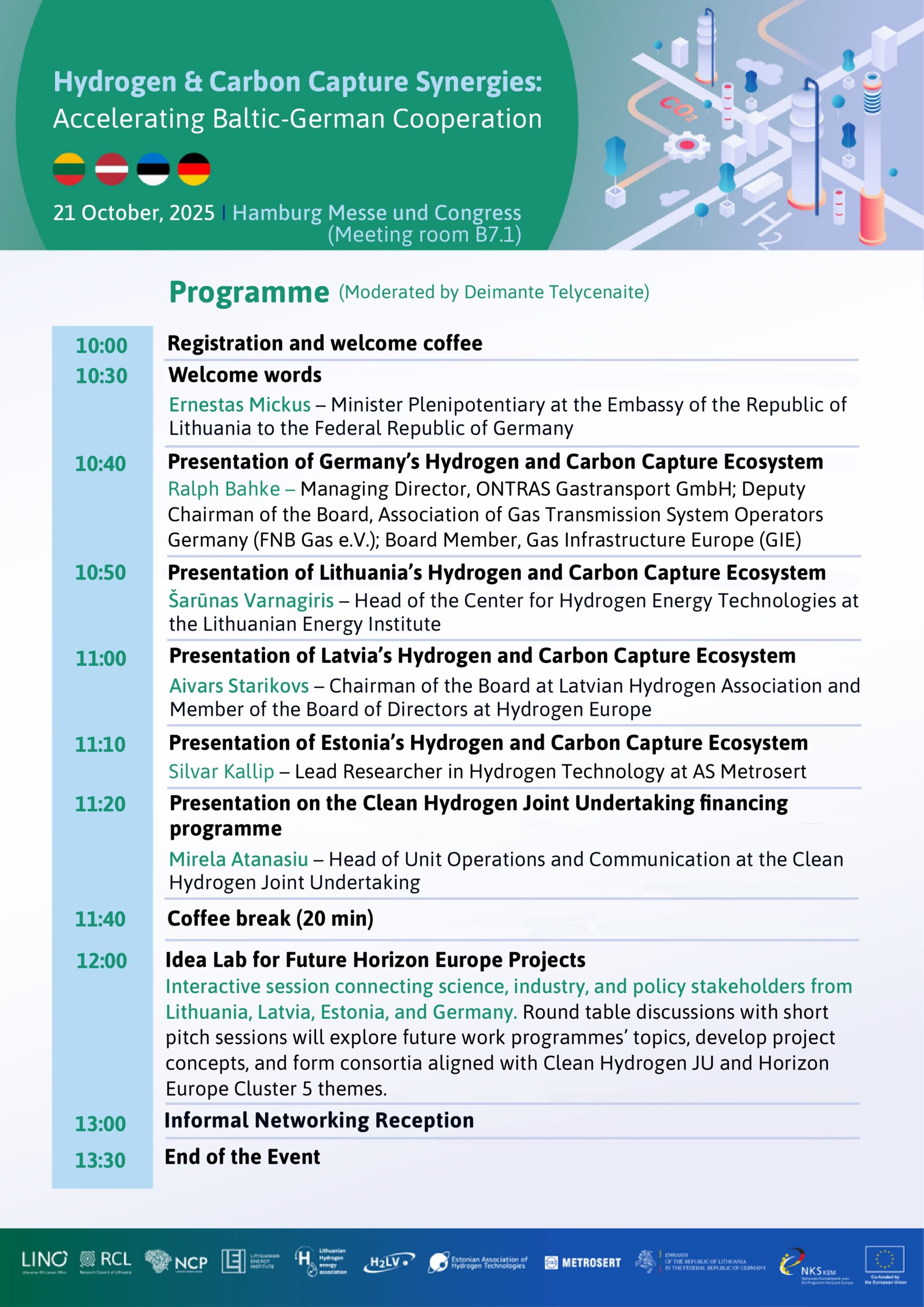 Baltijos šalių ir Vokietijos tyrėjų susitikimas vyks spalio 21 d. Hamburge, „Hydrogen and CCUS Technology World Expo“ parodos ir konferencijos metu, „Hamburg Messe und Congress“ centre.