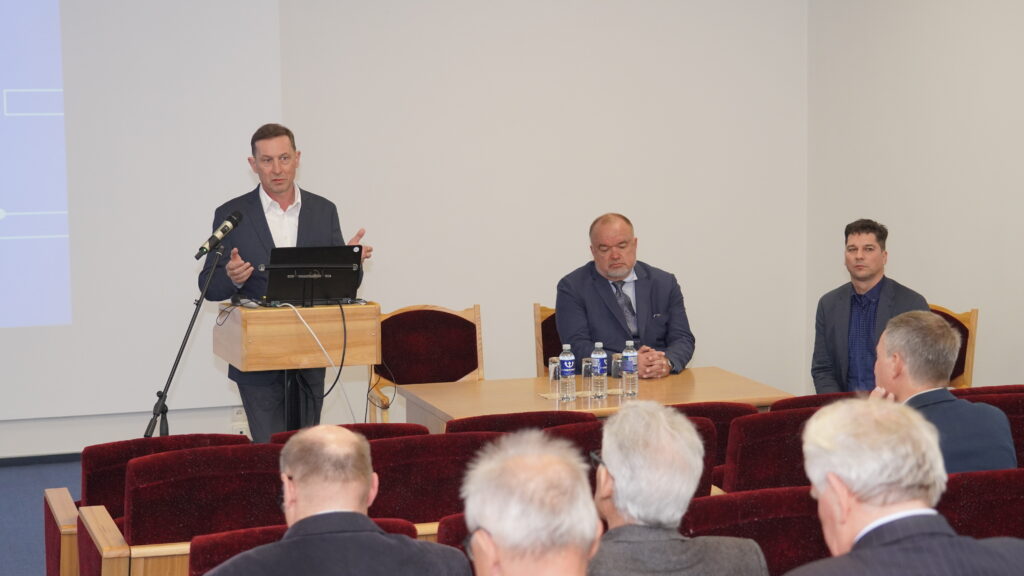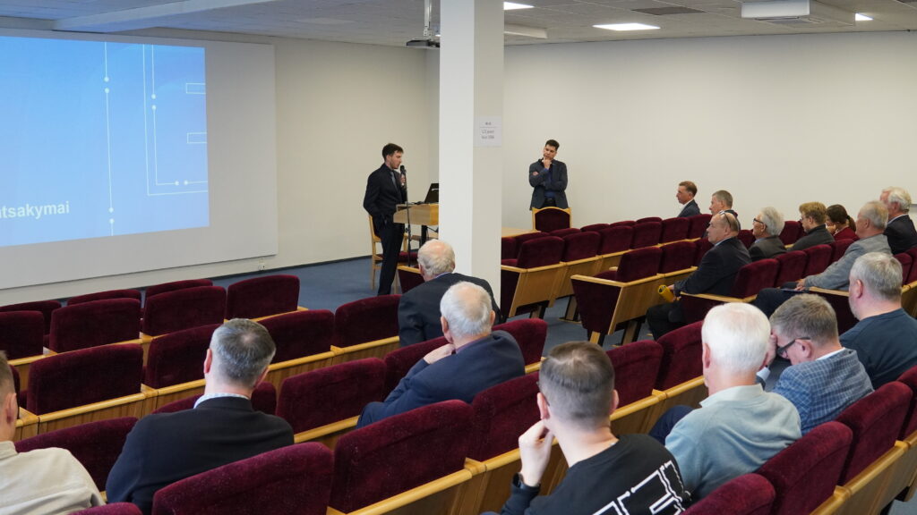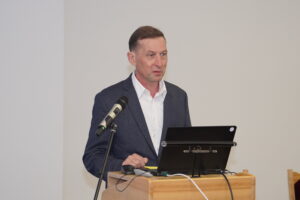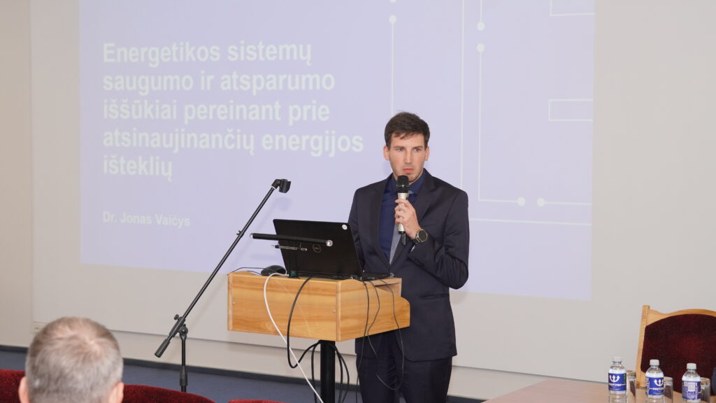 Dr. Jonas Vaičys savo pranešime „Energetikos sistemų saugumo ir atsparumo iššūkiai pereinant prie atsinaujinančių energijos išteklių“ aptarė elektros sistemų transformaciją ir su tuo susijusius techninius bei saugumo aspektus. Jis pristatė KTU vykdomus tyrimus, susijusius su energijos sistemų stabilumu, įtampos viršįtampių valdymu ir neutralės įžeminimo koncepcijomis, taip pat realaus laiko tinklų modeliavimu ir kibernetinio saugumo testavimu. Pranešėjas pabrėžė, kad pereinant prie atsinaujinančių energijos išteklių, būtina diegti išmanius tinklo valdymo sprendimus ir užtikrinti sistemos atsparumą bei saugų veikimą.