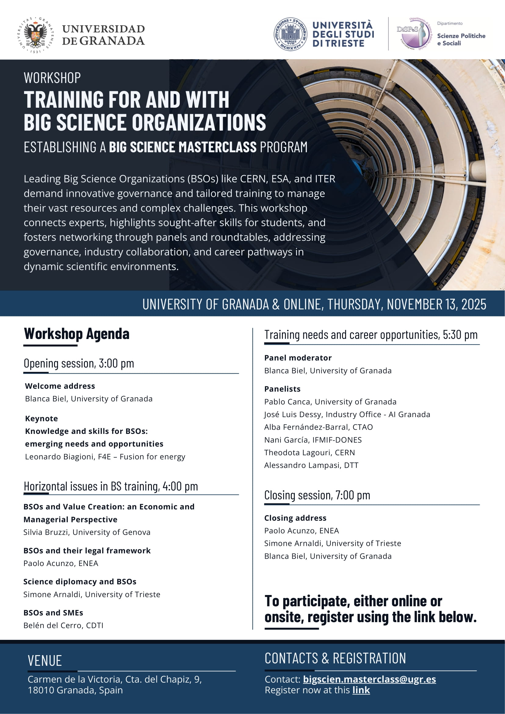 The workshop “Training for and with Big Science Organizations” will be held on Thursday, November 13, 2025, from 3:00 to 7:00 p.m. (4:00 to 8:00 pm Lithuanian time) at the Carmen de la Victoria, University of Granada. Participants can join either on-site or online.