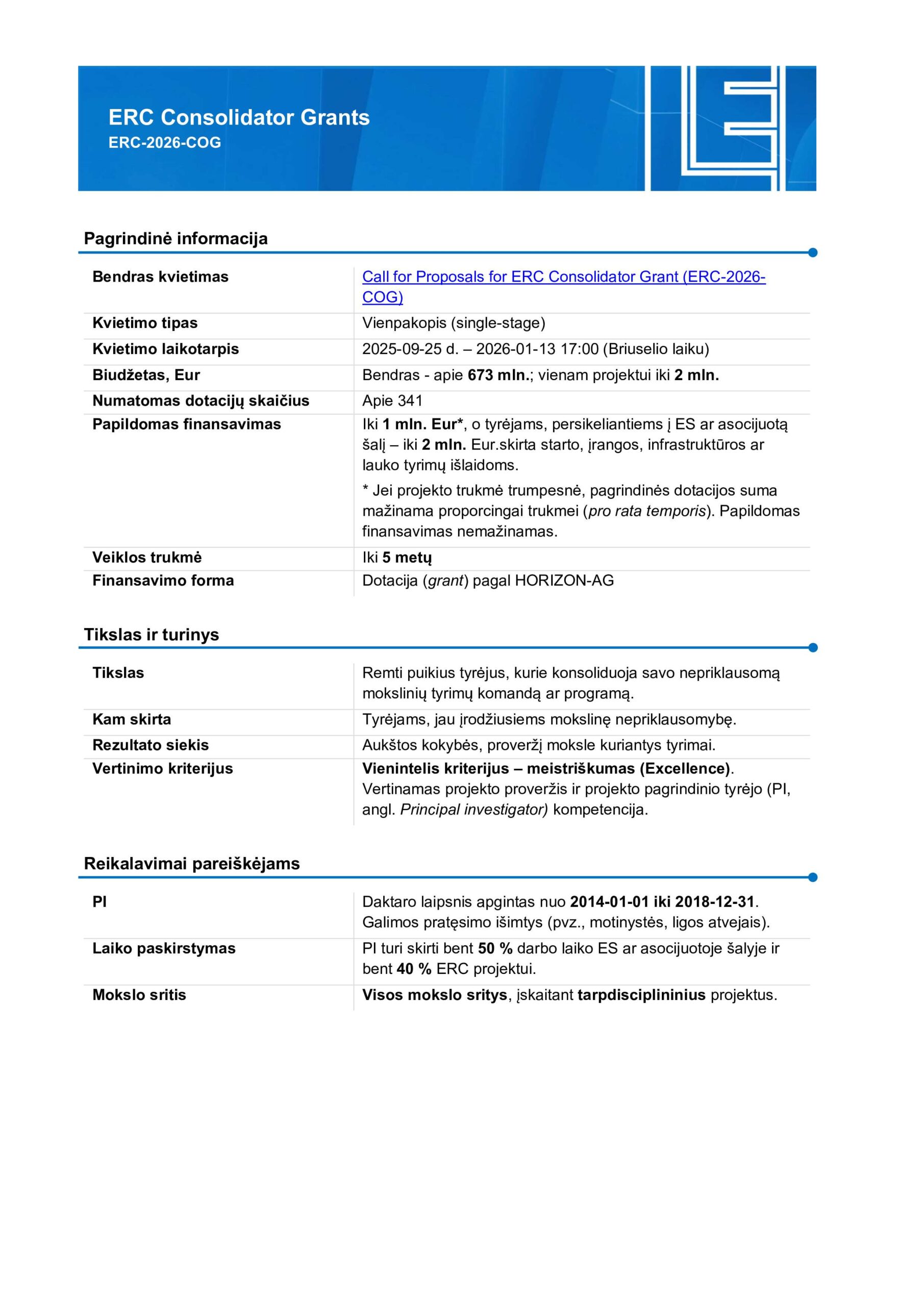 Siekiant padėti tyrėjams geriau pasirengti paraiškos teikimui, Estijos, Latvijos ir Lietuvos mokslo tarybų nacionaliniai kontaktiniai asmenys kviečia dalyvauti informaciniame renginyje, skirtame Europos mokslo tarybos (ERC) kvietimo teikti paraiškas įsitvirtinantiems tyrėjams – ERC Consolidator Grant 2026 – pristatymui.