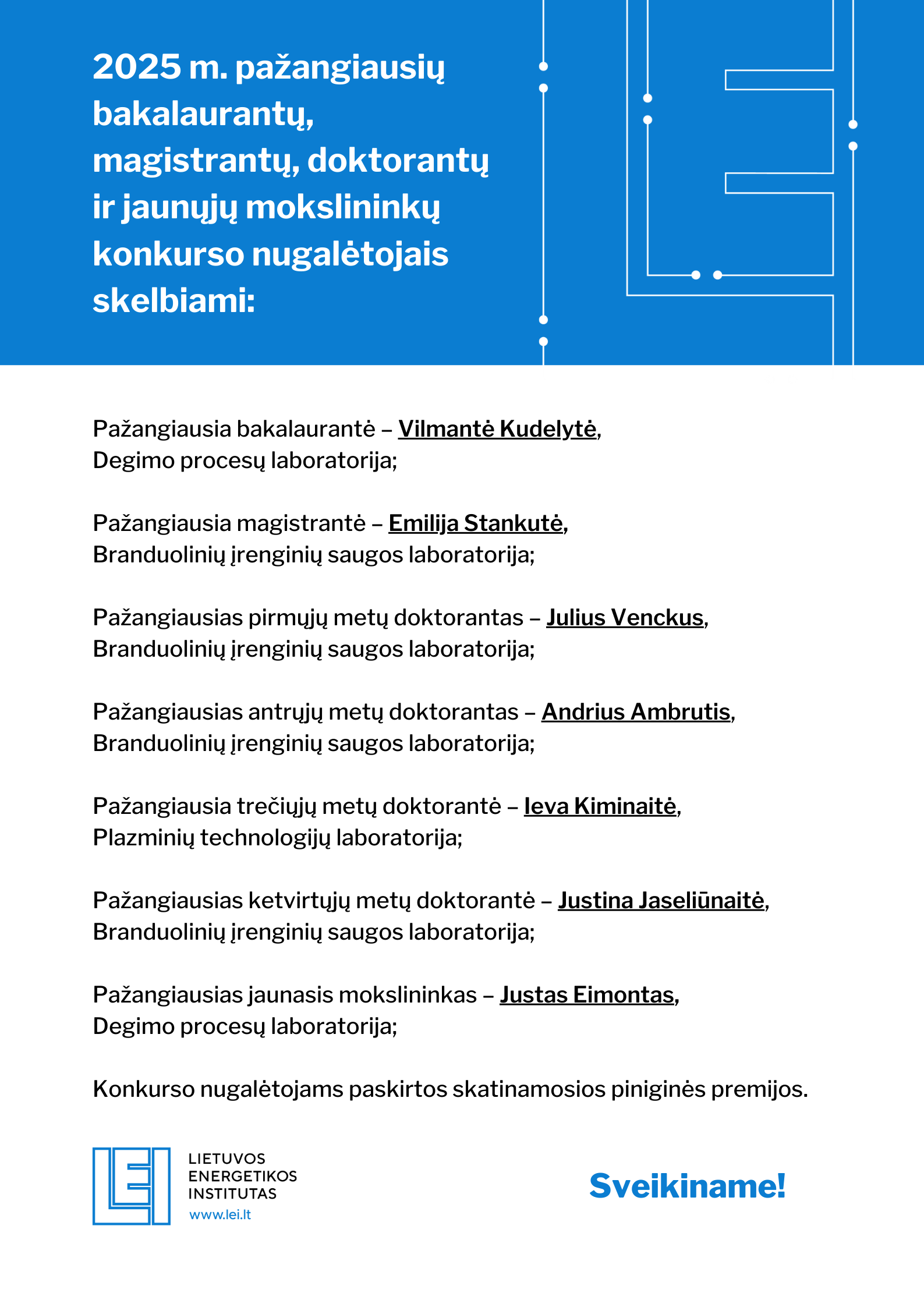 Pasibaigus konkursui, buvo išrinkti Lietuvos energetikos instituto 2025 m. pažangiausi magistrantai, doktorantai ir jaunieji mokslininkai!