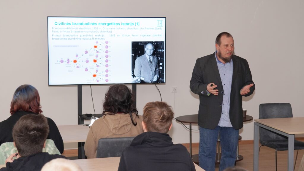 Branduolinių įrenginių saugos laboratorijos vyriausiasis mokslo darbuotojas dr. Tadas Kaliatka aštuntokams skaitė paskaitą „Branduolinė energetika: ateitis ar baubas?“. Mokslininkas pristatė branduolinės energetikos istoriją, apžvelgė pasaulio ir Lietuvos situaciją šioje srityje. Moksleiviams jis pasakojo apie branduolines avarijas, jų priežastis ir pasekmes, bei branduolinę saugą, kurios srityje dirba ir LEI mokslininkai. Taip pat buvo pristatyti pažangūs moduliniai reaktoriai ir jų diegimo planai Europos Sąjungoje. Paskaitos klausiusiems moksleiviams dr. T. Kaliatka uždavė klausimų, o teisingai į juos atsakiusieji laimėjo prizus – LEI suvenyrus.