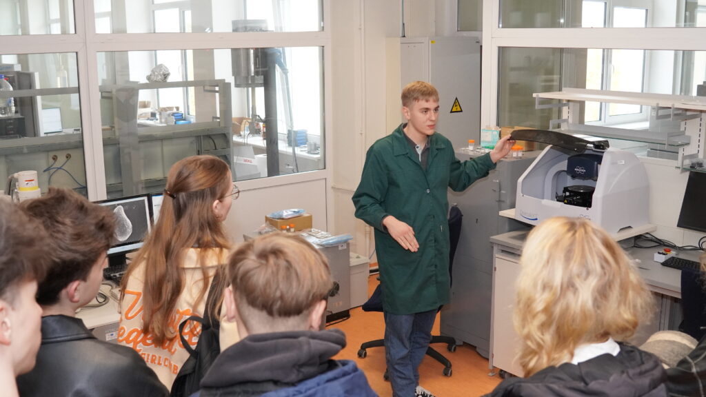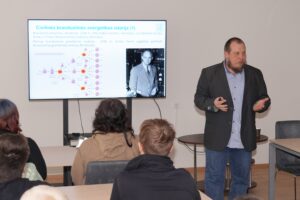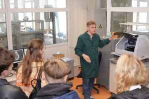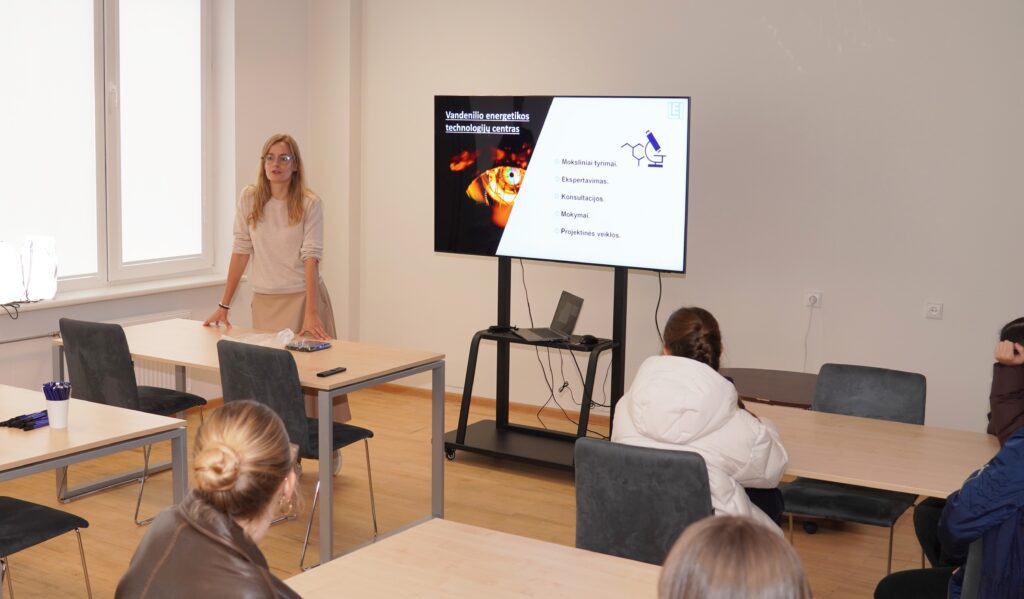 Vandenilio energetikos technologijų centro vyresnioji mokslo darbuotoja dr. Simona Tučkutė dešimtokus supažindino su šiuolaikinėmis vandenilio energetikos technologijomis, o laborantas Artem Dedenok vedė ekskursiją po centrą, pristatydamas mokslinę įrangą ir atliekamus tyrimus.