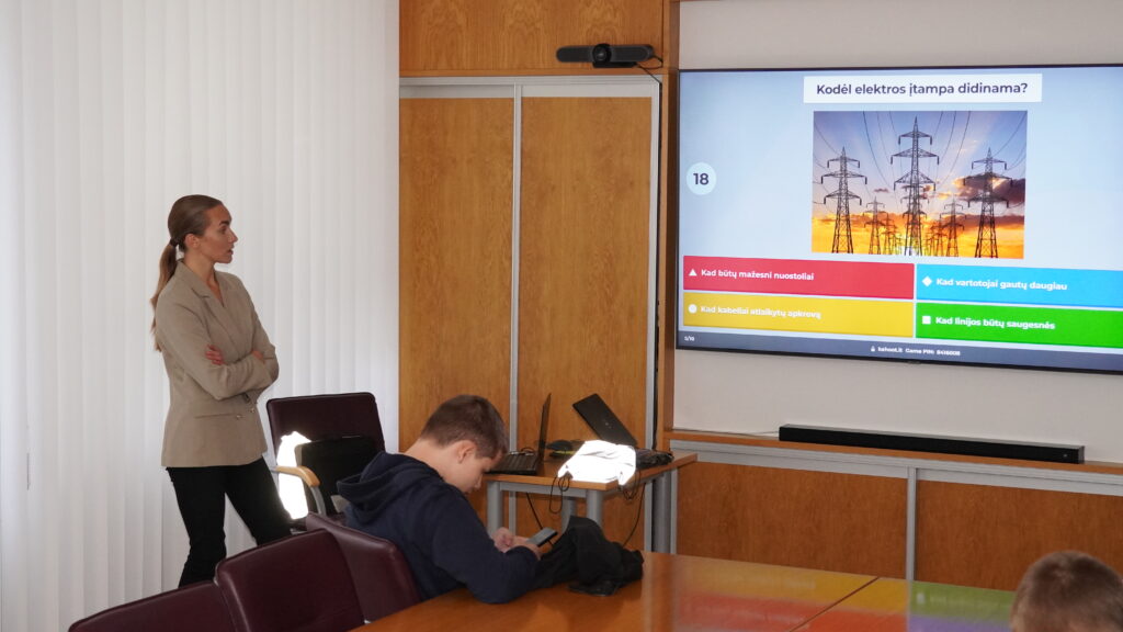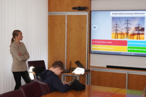 Edukacijos „Energijos kelionė nuo A iki Z“ metu Energetikos kompleksinių tyrimų laboratorijos doktorantė, jaunesnioji mokslo darbuotoja Rimantė Balsiūnaitė supažindino moksleivius su energijos kelione nuo gamybos vietos iki pat elektros lizdo, o užsiėmimo pabaigoje vyko interaktyvus protmūšis.