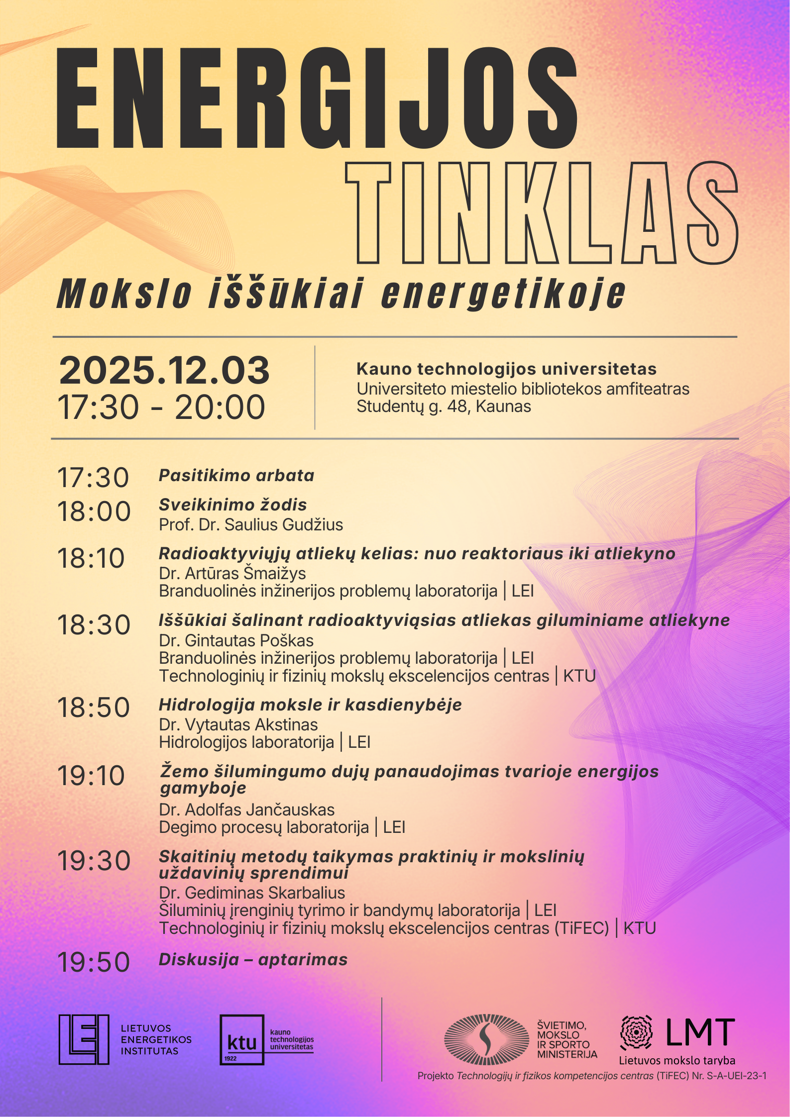 Renginio metu pranešimus skaitys ir patirtimi dalinsis Lietuvos energetikos instituto bei KTU Technologinių ir fizinių mokslų ekscelencijos centro (TiFEC) projekto mokslininkai. Jie pristatys naujausius mokslinius tyrimus ir inovacijas branduolinės energetikos, termoinžinerijos ir kitose srityse.